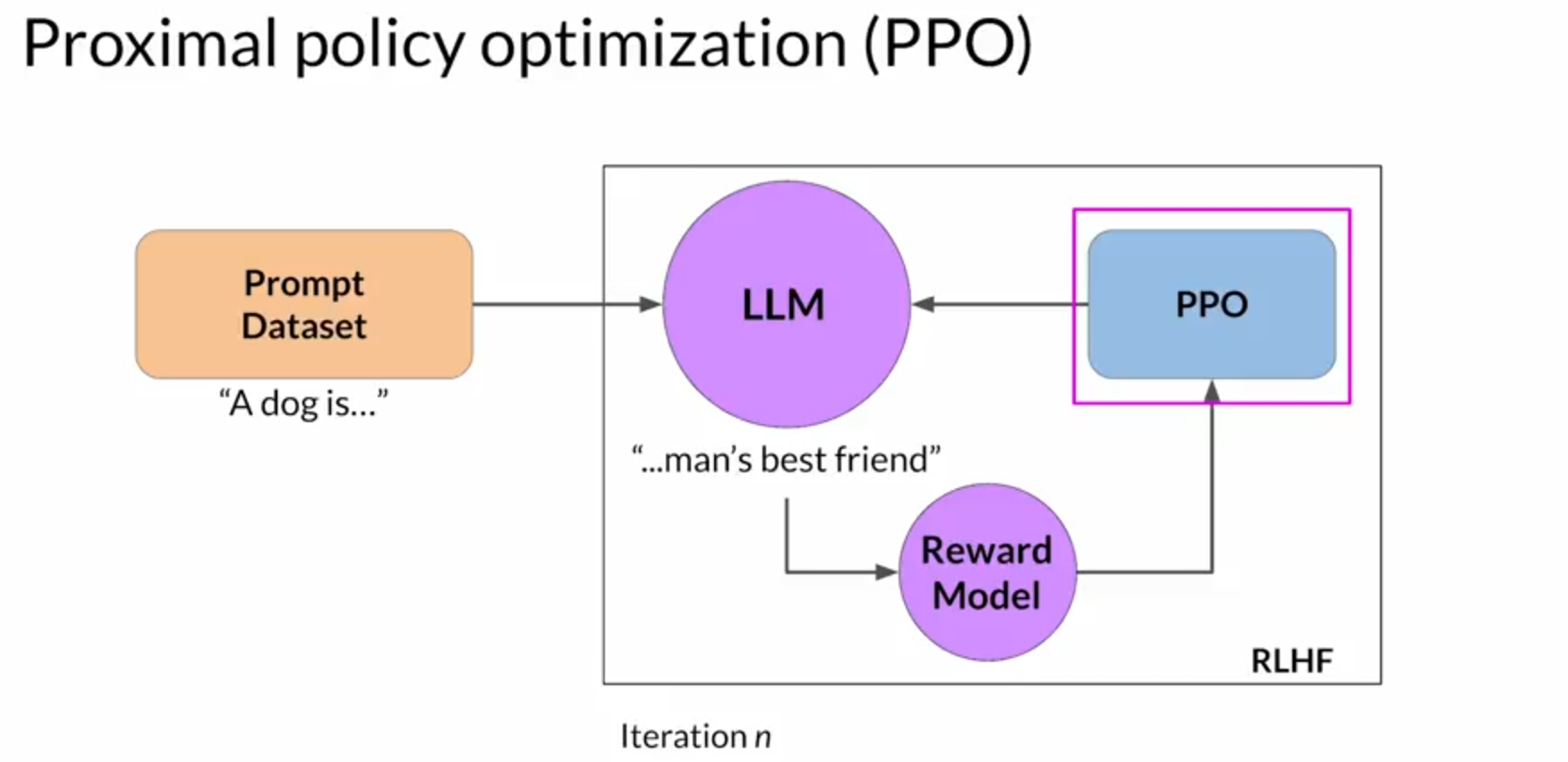 PPO is the reinforcement learning algorithm used in RLHF to fine-tune LLMs ,maximizing rewards based on human feedback while carefully controlling how far the model drifts from its pre-trained knowledge.